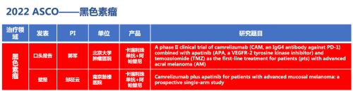 黑色素瘤领域的2篇研究摘要,采用EVO视讯医药自主研发的PD-1抑制剂卡瑞利珠单抗(艾瑞卡)联合阿帕替尼(艾坦)(“双艾”组合)的免疫联合抗血管(或再联合化疗)的治疗策略。